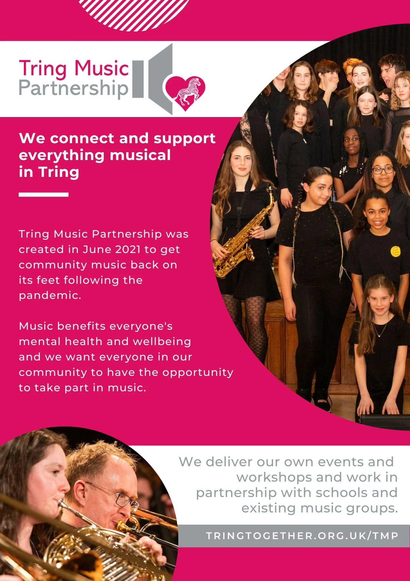 Tring Music Partnership (TMP) was created in June 2021 to get community music back on its feet following the pandemic. Music benefits everyone’s mental health and wellbeing and we want everyone in our community to have the opportunity to take part in music.